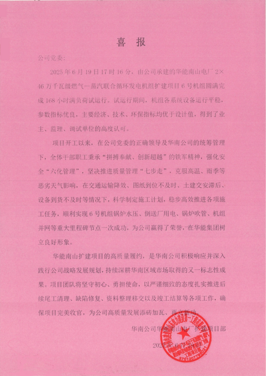华能南山扩建项目6号机组顺利通过168小时满负荷试运行